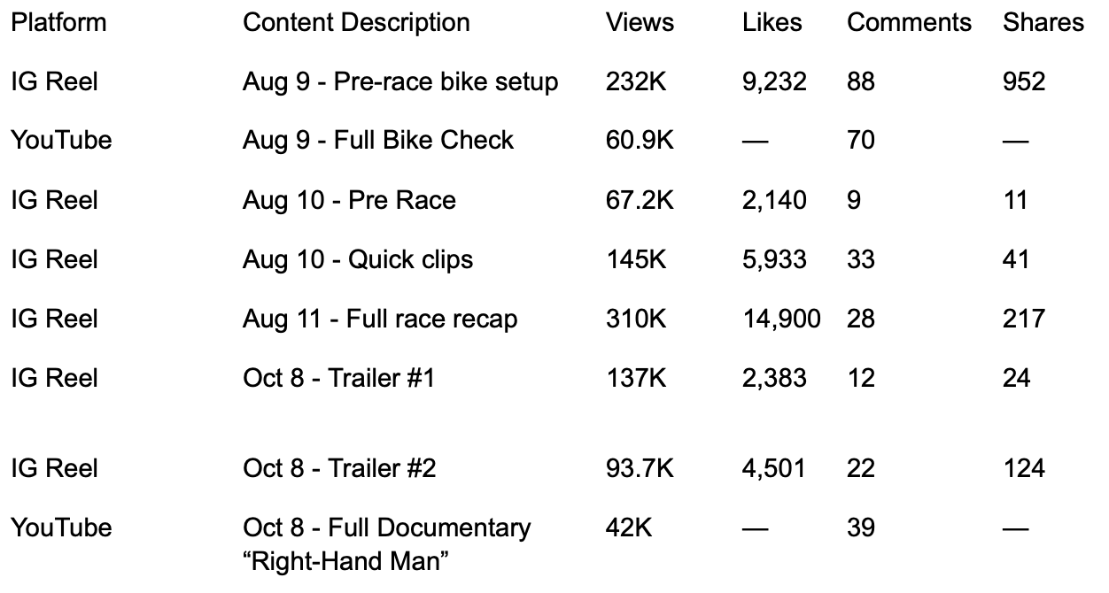 Short-form content gave us the spark. Viewers were drawn in by the action, the bike, the vibe. These clips reached a massive audience (~1M views across videos) and earned over 50K interactions.